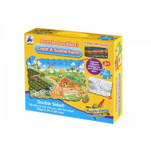 Пазл 2в1: одновременно картинка, состоящая из фрагментов и раскраска. В наборе «Ферма» пазл, состоящий из 50 фрагментов, а также набор цветных 4 восковых карандашей. Фрагменты пазла изготовлены из плотного картона, они не гнутся, а на ощупь гладкие. С одной стороны изображение на деталях цветное, на обратной - черно-белое. Перед ребенком задачи: собрать пазл и, перевернув его на обратную сторону, раскрасить. Собранная картинка размером 82х54 см. Собирая пазл, дети будут развивать мелкую моторику, координацию и ловкость движений, а ища необходимое место для вкладыша, память и логическое мышление. Рекомендуемый возраст: 3+.