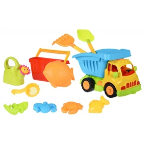 Великий набір для активних та цікавих ігор на пляжі або в пісочниці. В набір входить 11 од: велика вантажівка; 5 пасочок (2 великі риби, краб, русалка, морський коник); сито ; граблі ; лопатка; лійка; відерце. Усі елементи великі, фактурні, приємні на дотик. Довжина вантажівки 43 см. Лопата та граблі по 50 см довжиною. Кабіна жовтого кольору, кузов – блакитний. Рекомендовано дітям від 3-х років.