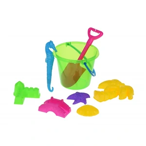 Набір із зеленим відерцем для ігор у пісочниці. Іграшки можна використовувати для ігор на пляжі. У комплекті: лопатка, 5 пасочек, відерце, іграшка-поплавок. В наборі є багато різноманітних деталей, які зроблять гру цікавою – ракушка, морська зірка, деталі для замку (2 шт), пальма. Також є фігурка морського коника, яку можна використовувати як поплавець. Всі деталі пластикові; матеріал безпечний, абсолютно нетоксичний. Набір для дітей від 3 років. Відерце зеленого кольору,розміром 13х15х19 см.