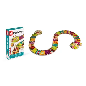 Компактна і захоплива настільна гра від французького бренда Janod. Гра для 2-4 гравців віком від 3-х до 7-ми років. Щоб почати гру – необхідно скласти ігрове поле у вигляді стежки. Її елементи збираються між собою за принципом пазлів. Малюнки на них різнокольорові і надзвичайно деталізовані. Також у наборі гральний кубик та 4 дерев’яні фішки у вигляді курчат. Гра допоможе дітям вивчити кольори та цифри, а також розвити дрібну моторику і навички тактики.