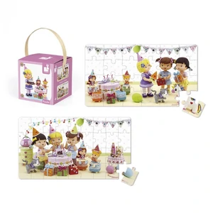 Набір двох пазлів «Свято Джульєтти» від французького виробника Janod. На картинках зображені дівчата, що святкують День народження подруги, дарують їй подарунки, святкують на солодким столом. і Один пазл на 24 елемента, другий – на 36 шт. Розмір кожного зображення 40 х 22 см. Деталі пазлів вироблені із цупкого картону. Зображення на них у природніх яскравих кольорах. Пазли постачаються у квадратній коробці із текстильною ручкою – ідеальний варіант для подарунка дівчинці. Рекомендований вік: 3+