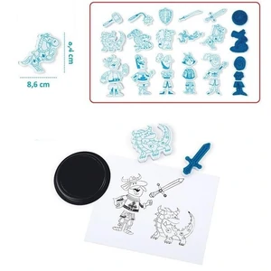 Набір для творчості Штампи Лицарі французького бренду Janod містить 30 зручних штампів різних форм і розмірів, із зображенням середньовічного світу лицарів: дракони, зброя, коні і п'ять фігур лицарів. З їх допомогою ви можете створювати унікальні композиції, а відображені зображення можна додатково розфарбовувати. Штампи зроблені з більш приємного на дотик еластичного пінопласту і гумової поверхні, на якій нанесено зображення штампування. У комплект також входять чорні чорнила. Штампування для дитини - це довгі моменти захоплюючого і заспокійливого веселощів