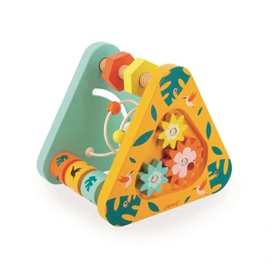 Цей яскраво-кольоровий трикутник перенесе вас у тропічну пригоду! Ця іграшка для раннього навчання обіцяє багато нових відкриттів для дитини. Ця дерев'яна іграшка ідеально підходить для 7 видів діяльності: лабіринт, дзеркало, шестерінки для обертання, гайки для закручування, рахівниці, дощова паличка та циліндри для вирівнювання. Діти віком від 1 року зможуть розвивати дрібну моторику, координацію та знайомитися з кольорами та формами! Фарба на водній основі. Виготовлений з деревини, сертифікованої FSCTM. Іграшка для дітей від 12 місяців.
